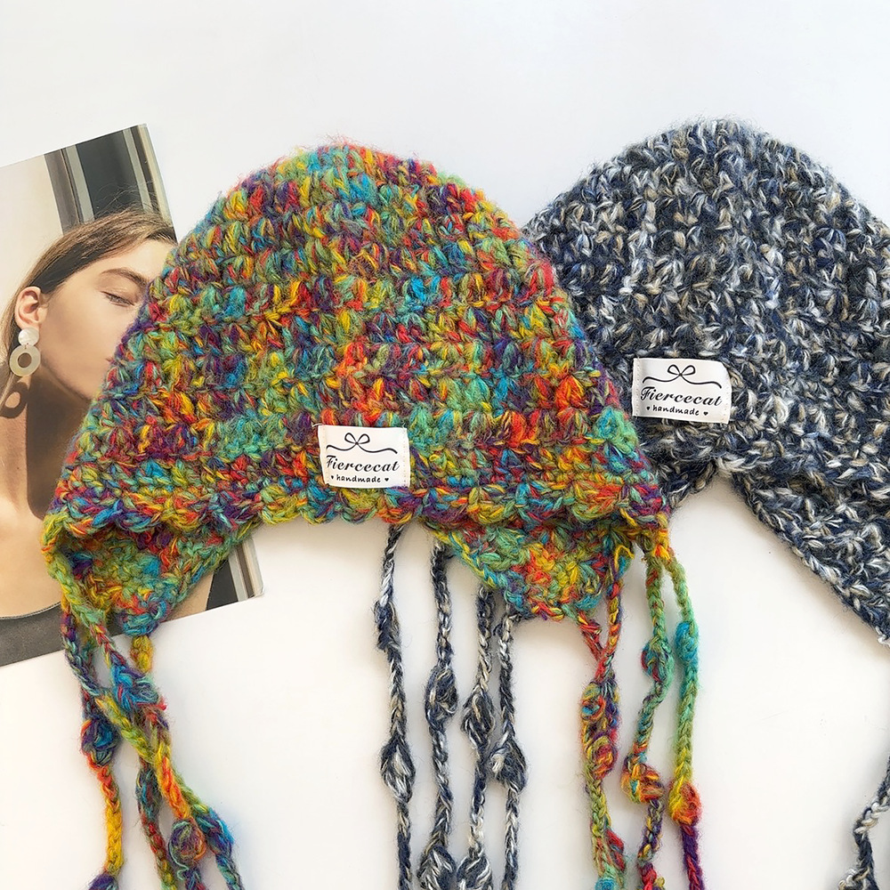 落雪白100%純手作り帽子 レディース 冬 2025年新作 ウールタッセル付き毛糸帽子 バンド付き耳当て付きレインボーハット