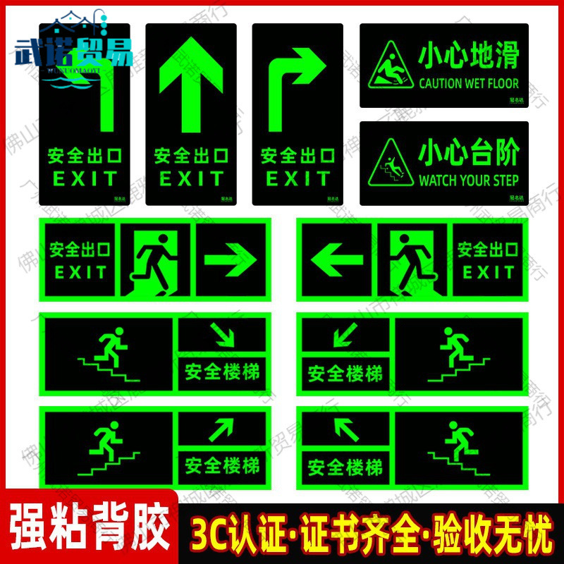輸出標識、火災標識、避難通路の床貼り警告、暗闇で光る壁貼り、注意、階段、床滑り、消火器