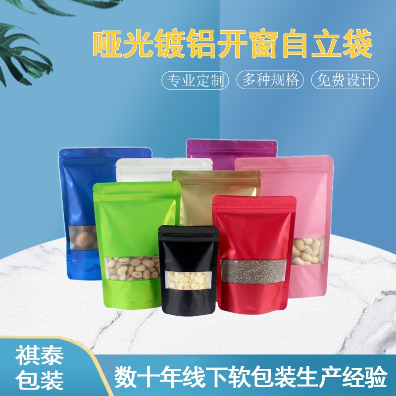 食品/菓子/ギフト用の葉の包装に最適: カラフルなマットアルミメッキの窓付き自立式ジップロックバッグ、厚みがあります。