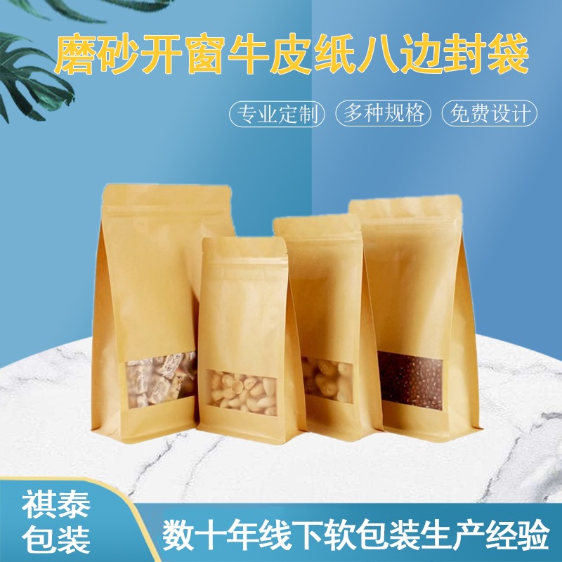 干物フロスト窓自立自封袋八辺封クラフト紙袋茶葉食品密封袋牛革包装袋