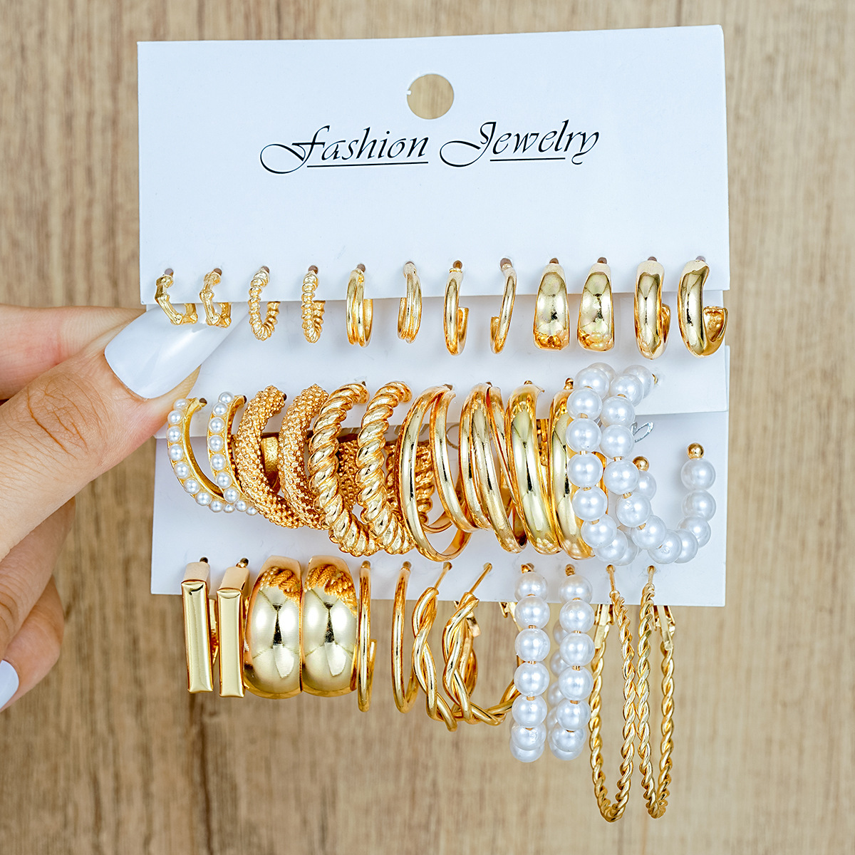 欧米の人気モデルのクロスボーダー幾何学真珠麻花イヤリング18点セットC型軽豪華気質女性イヤリングセット