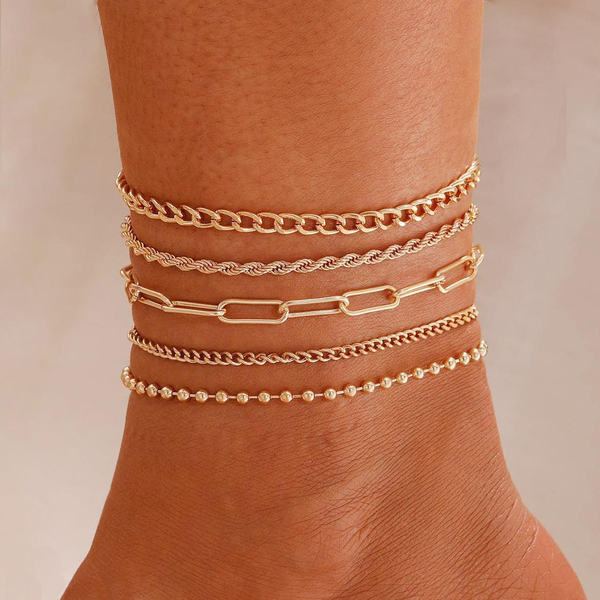 欧米の越境して新型の夏の砂浜の足のチェーンのスーツの5セットの個性の金属のチェーンのボールのチェーンの多層の足の装飾