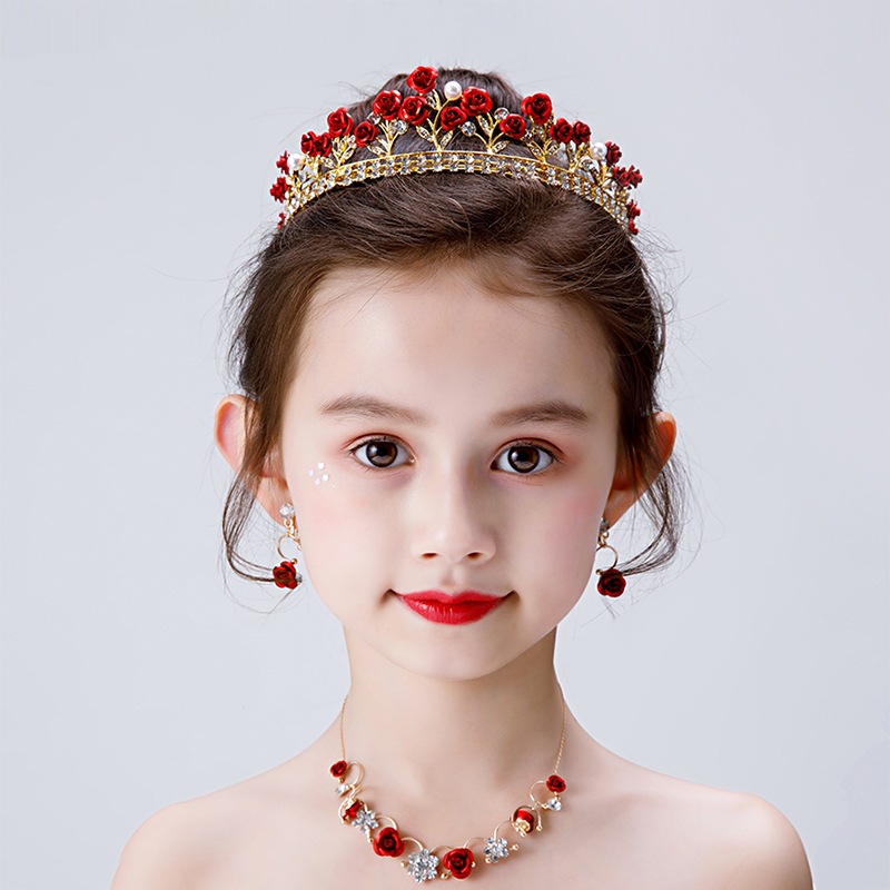 子供の頭飾りの女の子の王冠のネックレスのイヤリングのセットの赤い花のカチューシャはショーの王冠の誕生日の髪飾りを演出します。