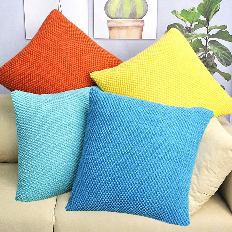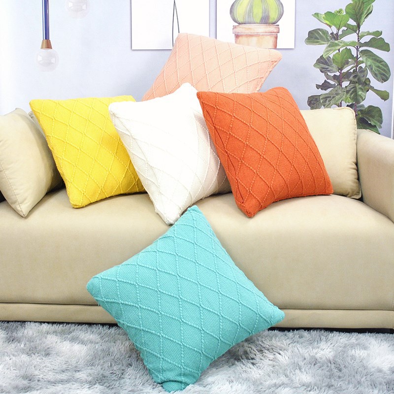 北欧レトロ菱格ニット抱き枕カバー純色お昼寝クッションカバーベッドの上に枕があります。