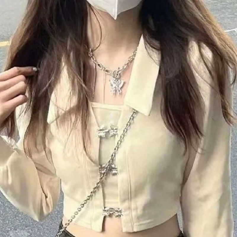 アメリカンシャツ長袖右肩ボトムシャツレディースデザインニッチスウィートガールショートスリムフィットフェイクツーピーストップ