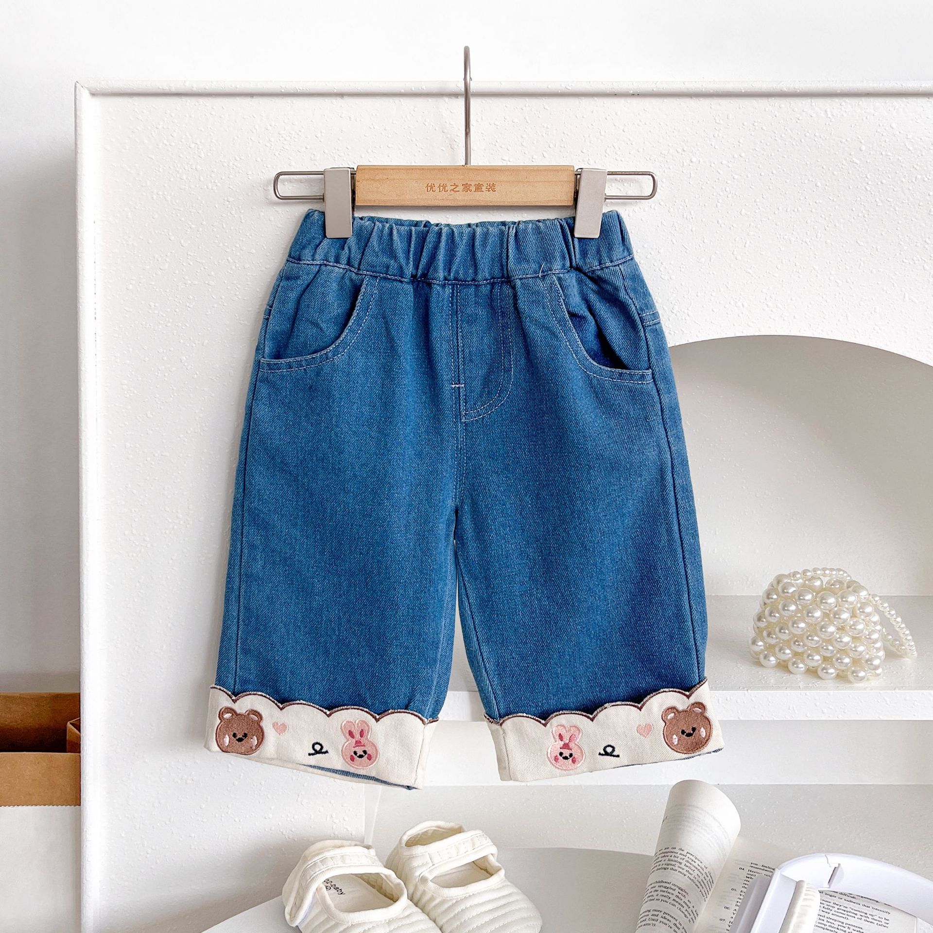 女の子のファッションジーンズ秋の韓国スタイル子供服女の赤ちゃんソフトジーンズ子供パンツレース新スタイル