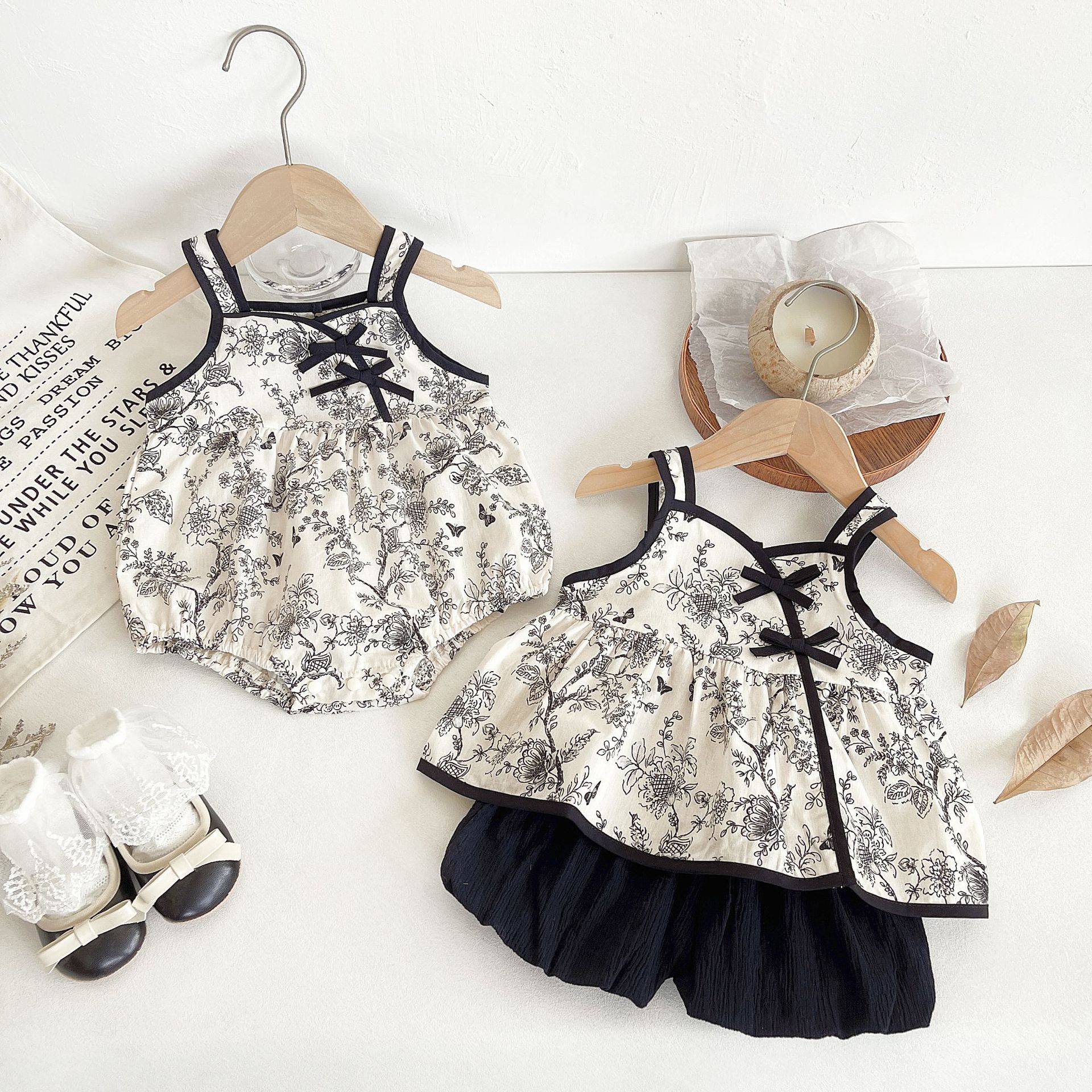 INSの新型の女の子の夏の薄いタイプの服の中国風の花の小さい皿は袖なしのお尻の服の子供のスーツを掛けます。
