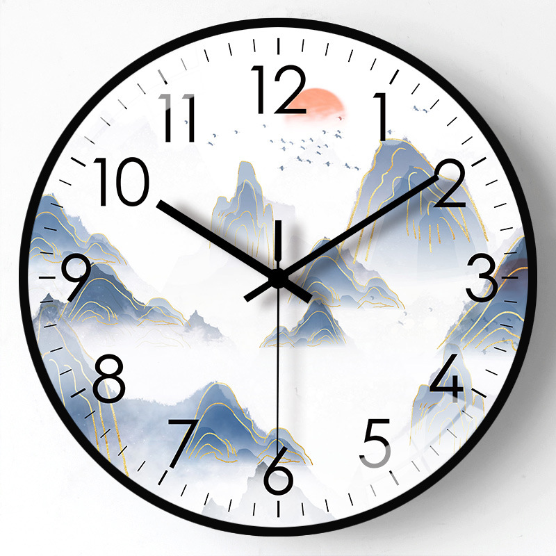【10インチ25cm】新中国風山水掛け時計家庭用客間静音無穴壁時計装飾