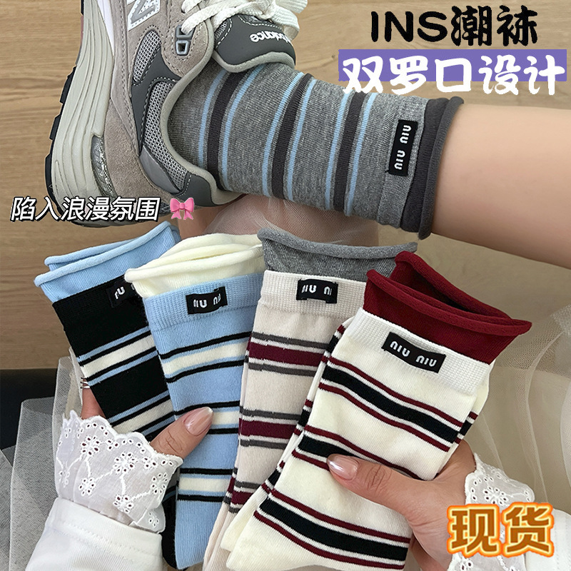 春夏韓系ins布標双羅口衝突色ステッチ無骨中筒積層靴下カップル復古縞靴下