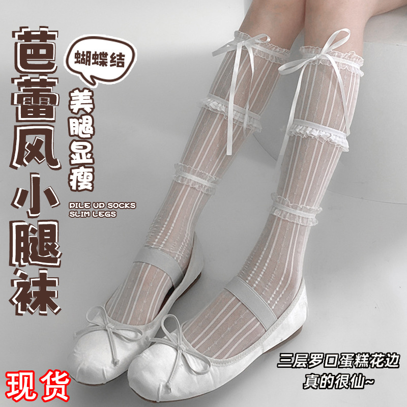 バレエスタイルメリージェーンホワイトレースリボンカーフソックス夏超薄型ミッドチューブパイルJKソックス