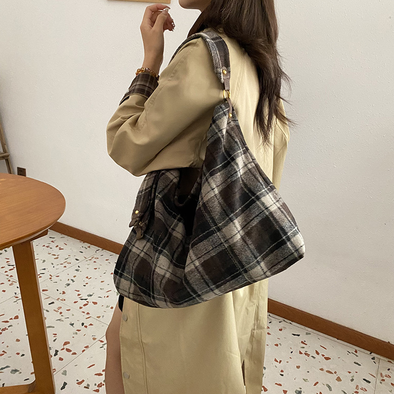 レトロな毛の格子のブリーフケースの女性秋冬2024の新型の小さい大衆のわきの下で大容量のショルダーバッグを包みます。