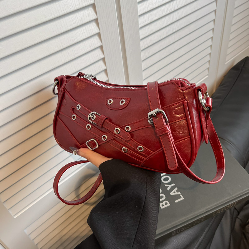 小衆レトロ赤シワ包女2025新型機関車ギャル風ベルトバックルシングル肩脇下包斜め掛けバッグ