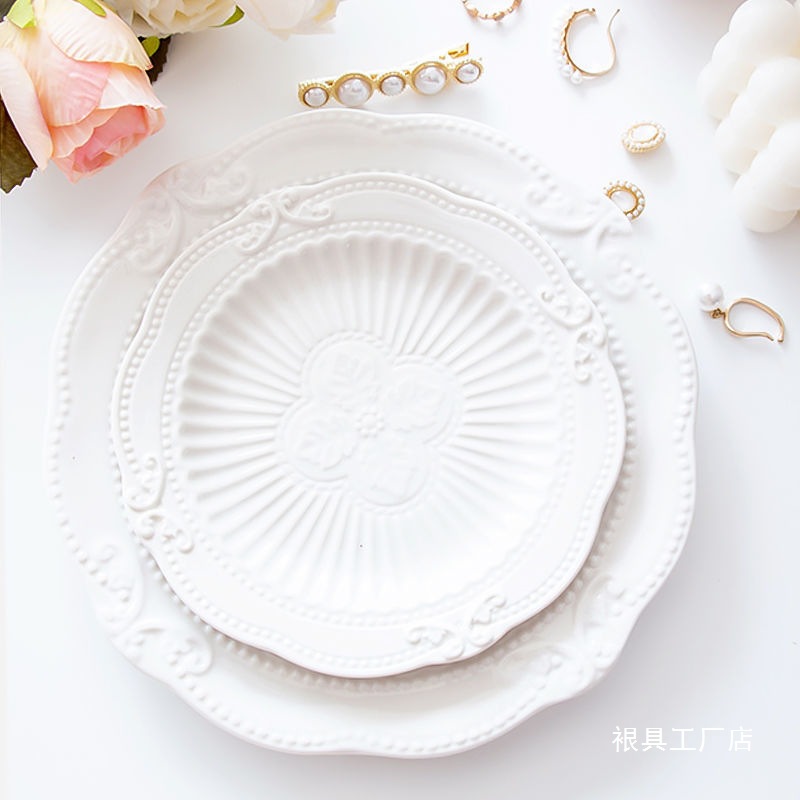 ヨーロッパの金縁エンボスレースフラワーレースセラミックプレートケーキプレート金縁洋食プレートデザートプレート牛卸売