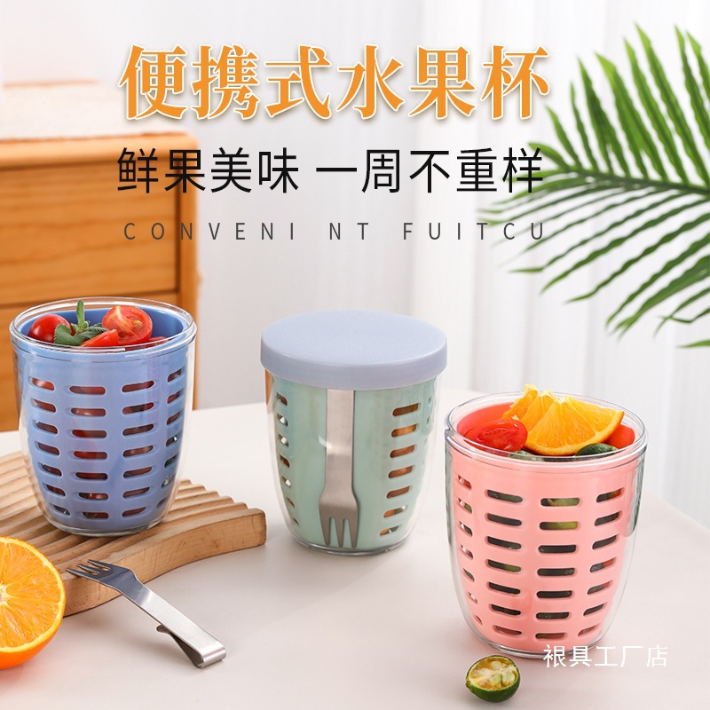 フォーク付きクロスボーダーポータブルフルーツカップ、大容量ウォーターカップ、水切り可能、密封、漏れ防止サラダボックス、ピクニック卸売