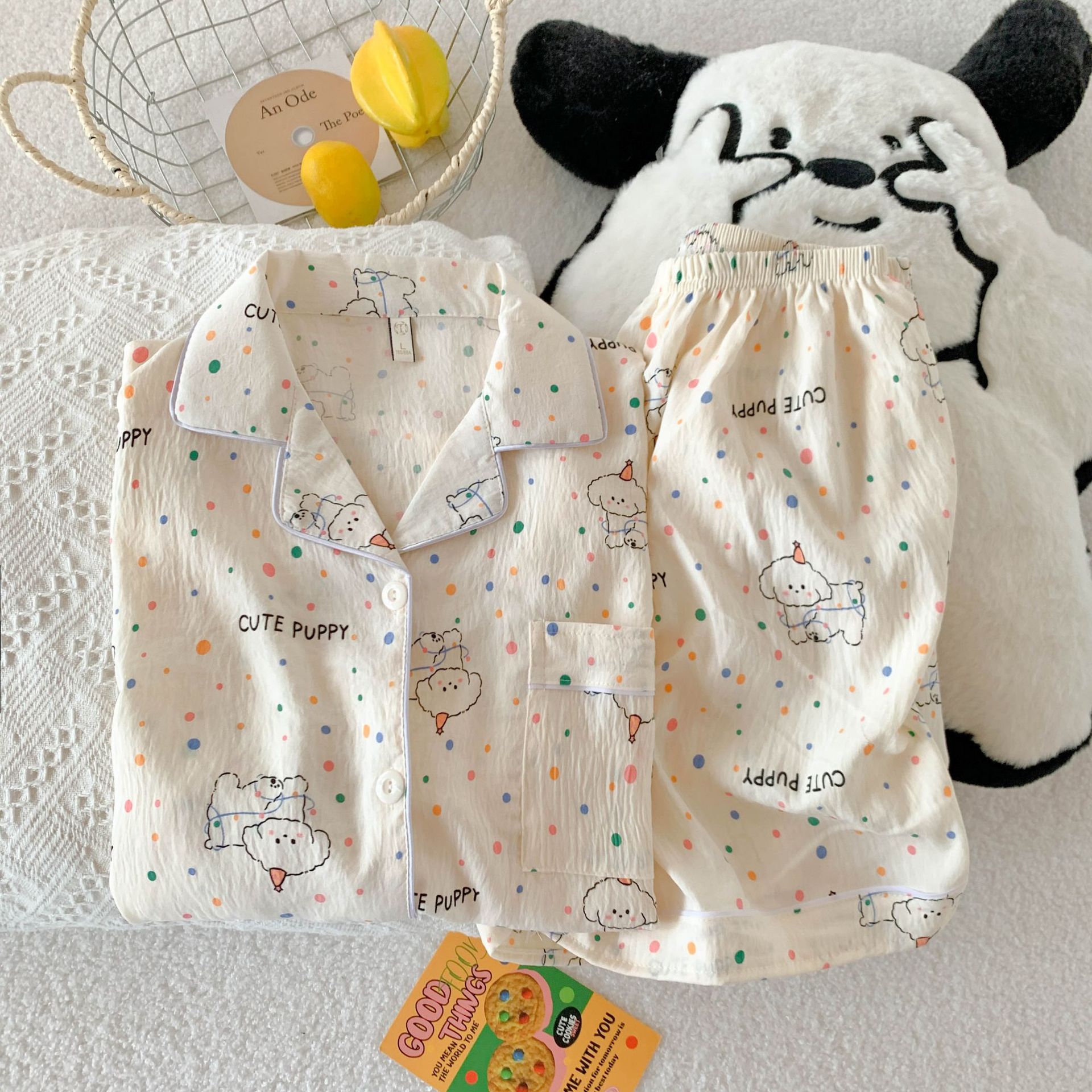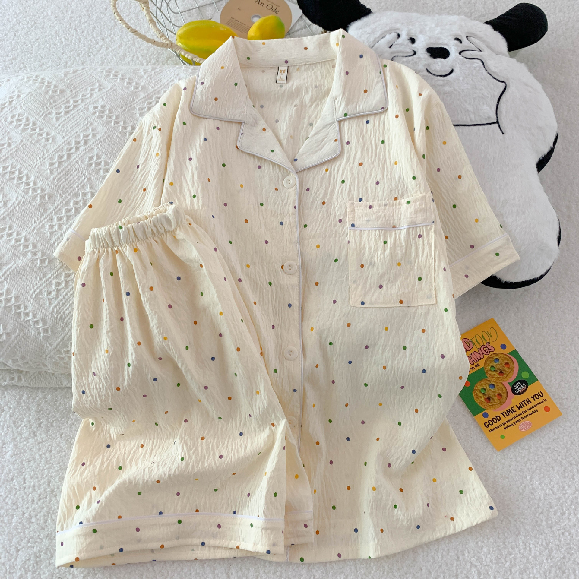 女性用パジャマ、夏用薄手クラウドコットン半袖ショーツ、甘くて可愛い水玉模様の中学生ホームウェアアウタースーツ
