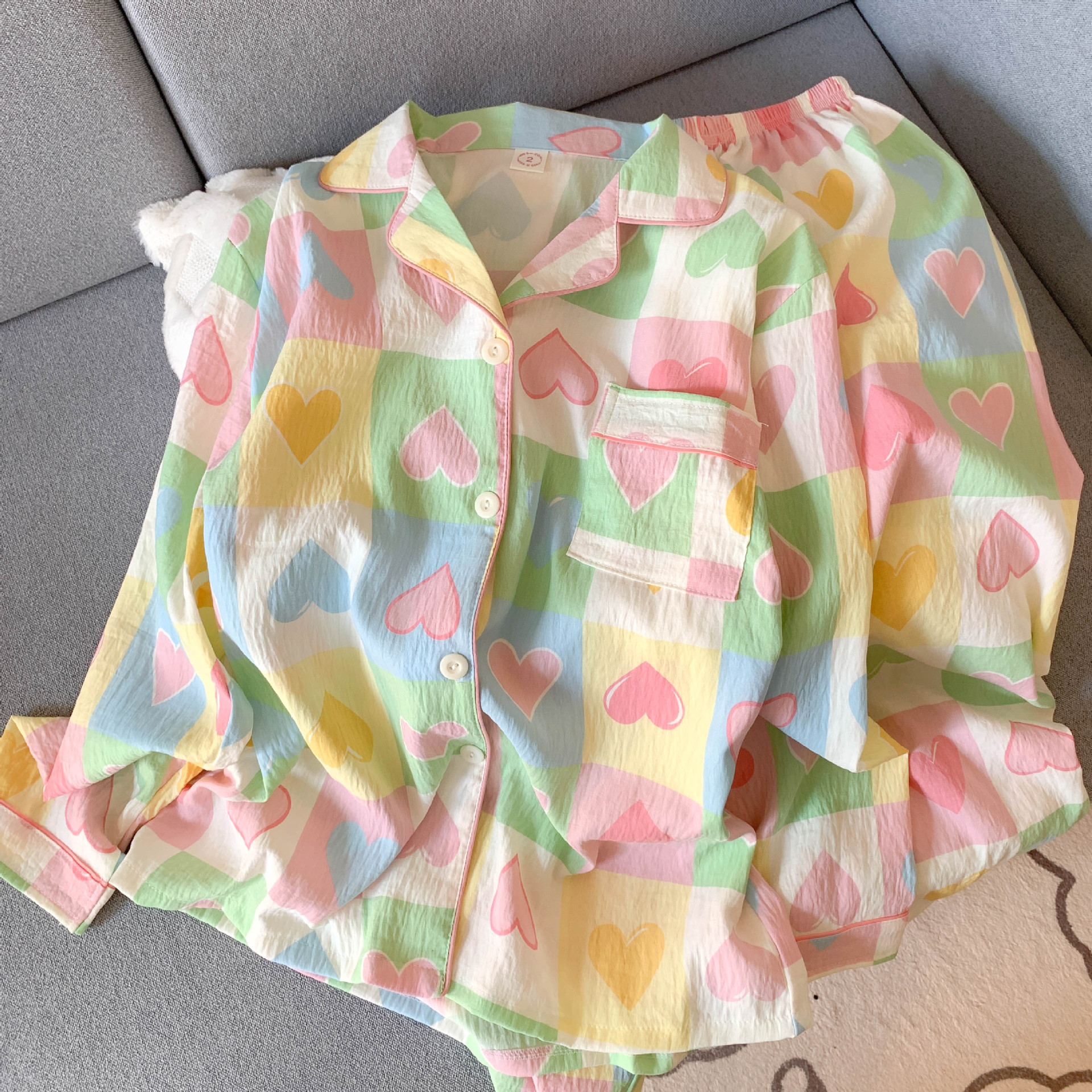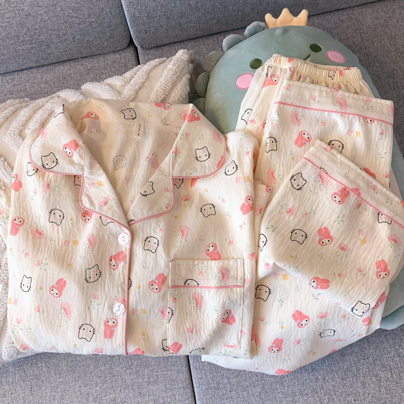 雲の綿の2つのセットの日本のパジャマの女性の夏の薄いタイプの半袖の半ズボンの学生の漫画のかわいい甘い家の服
