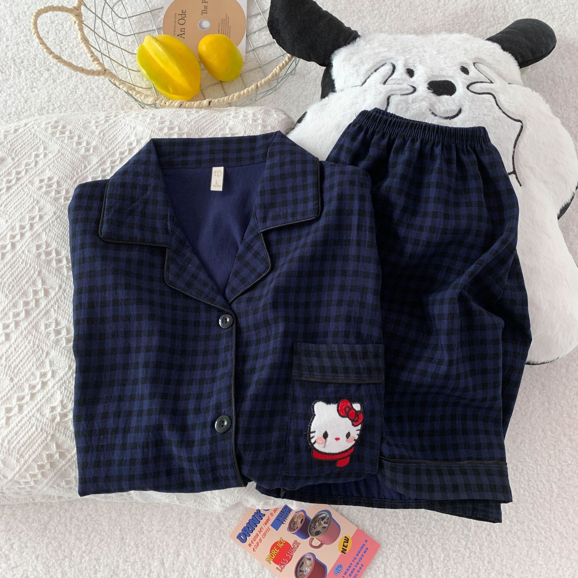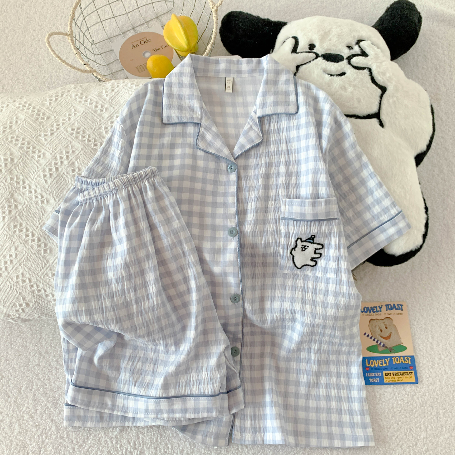 日系パジャマ女夏雲綿糸2025新半袖半ズボンかわいい青格子犬家服セット