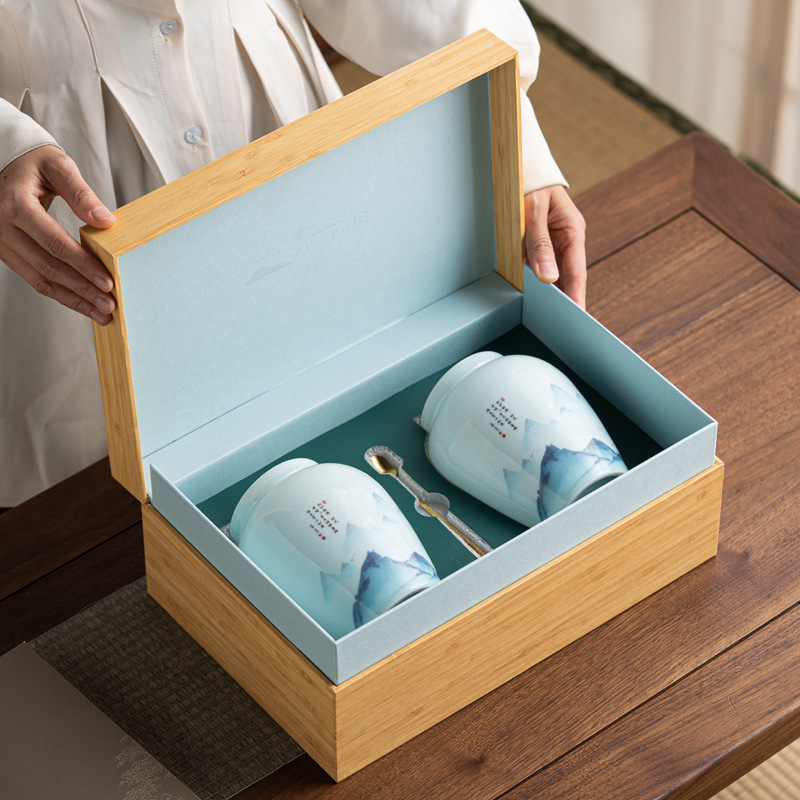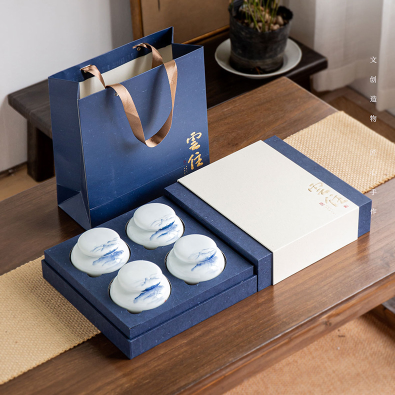 高級陶磁器のお茶の缶の空のプレゼントの箱の青い磁器の白いお茶の箱の贈り物の包装の箱の新しい中国式の千里江山の布の包み