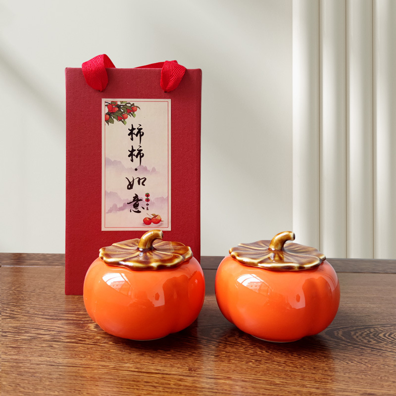 茶葉缶陶磁器柿万事密封缶喜糖茶葉箱如意お土産結婚祝いキャンディー缶柿礼