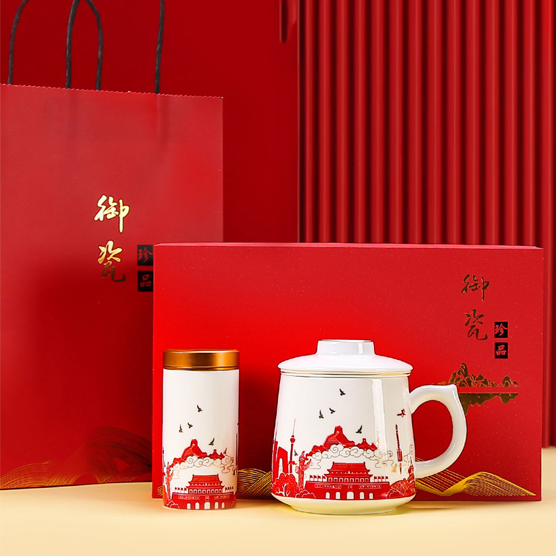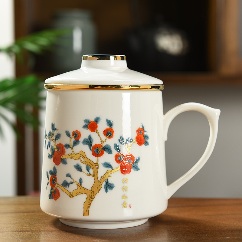 羊脂玉陶磁器マグカップオフィスカップ家庭用個人カップ蓋付き茶水分離カップギフトボックス