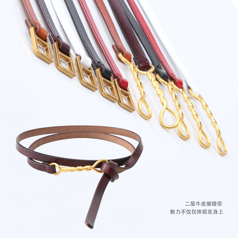 レディース牛革ベルト穴なしデザインレトロシンプル細ベルトレディースワンピース飾り小ベルト現物バッチ