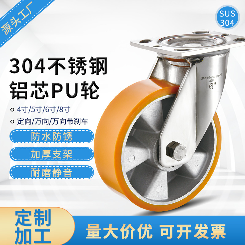 304重型ステンレス6インチアルミコアpuユニバーサルホイール4インチ5インチ8インチ静音ポリウレタンホイール手押し車