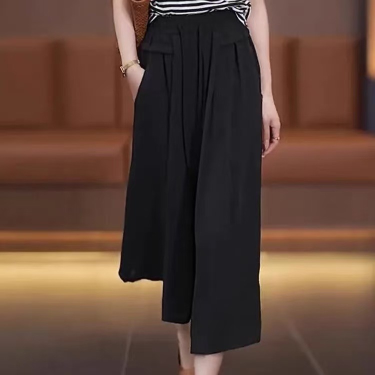 女性用アイスシルクワイドレッグクロップドパンツ、ハイウエスト、多用途、韓国風、レイジースタイルカジュアルパンツ、女性用ゆったり薄手スカートパンツ