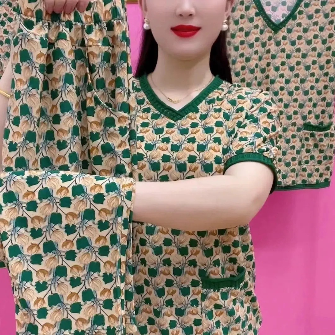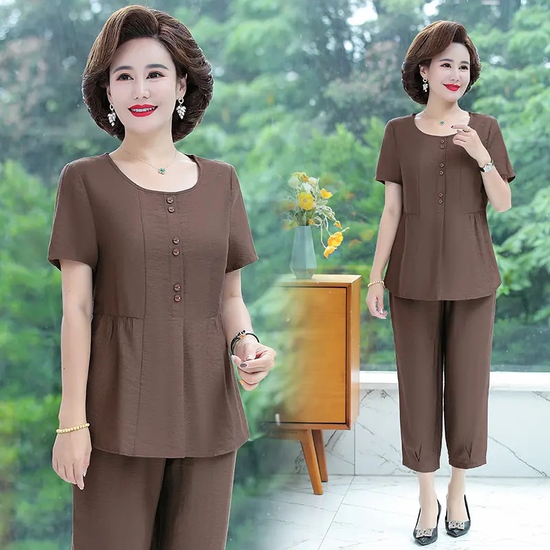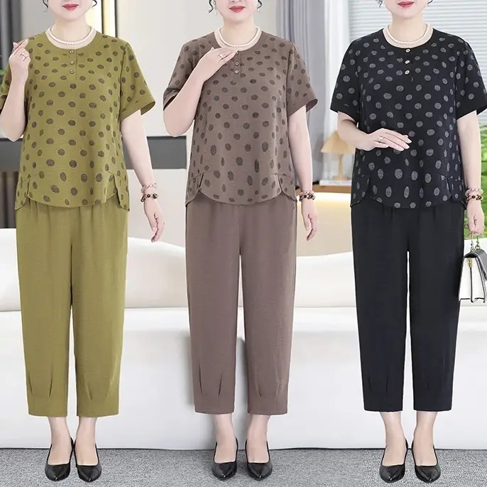 2025年女性用年齢軽減ファッションスーツ、夏の新しいスタイル、カジュアルな無地の痩身ツーピーススーツ、ゆったりとしたママ服