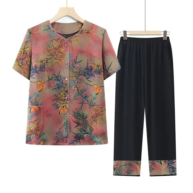 おばあちゃん半袖スーツ、中高年女性夏服、60代、70代、お母さん夏服、ポケット付き大きいサイズ