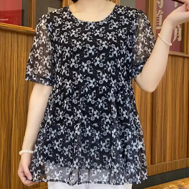 2025年夏人気のラウンドネックファッショナブルな伸縮性のある花柄の年齢を軽減するベビードールシャツトップ