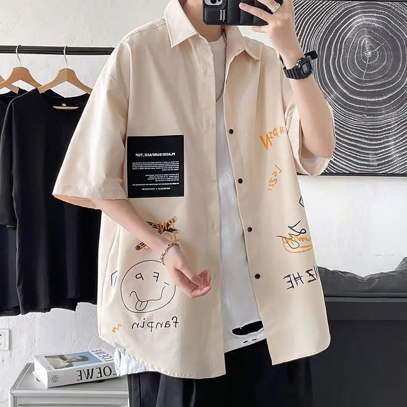 香港風シャツ男性夏カジュアル百合日系半袖落書きプリントトレンドinsシャツ半袖コート