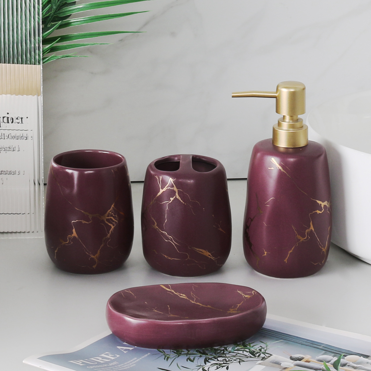 ホテルのトイレの陶磁器の洗面セット北欧の風呂の紫の赤い金の紋様の4セットのうがいの杯の手洗い液