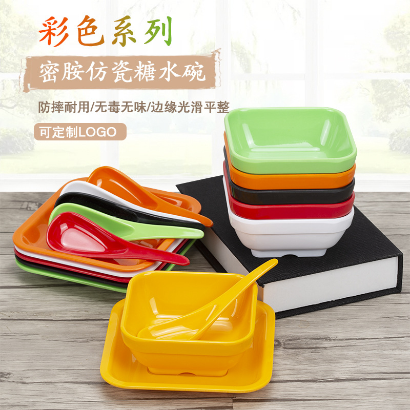 カラープラスチックの香港式の砂糖の水は四方のデザートの碗の軽食の碗のサプリメントの碗のスプーンの皿のセットを覚えています。