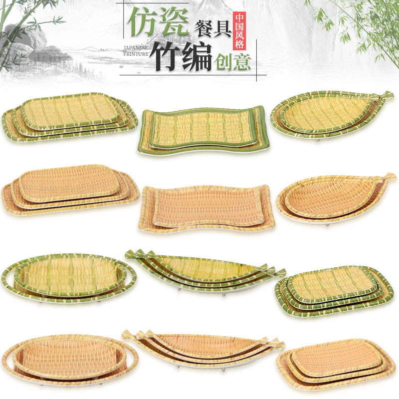 創意は磁器の竹をまねて箕を編んで野菜の皿のプラスチックの火の鍋の皿の寿司のバーベキューの皿のメラミンのお菓子の軽食の皿の食器を作ります。