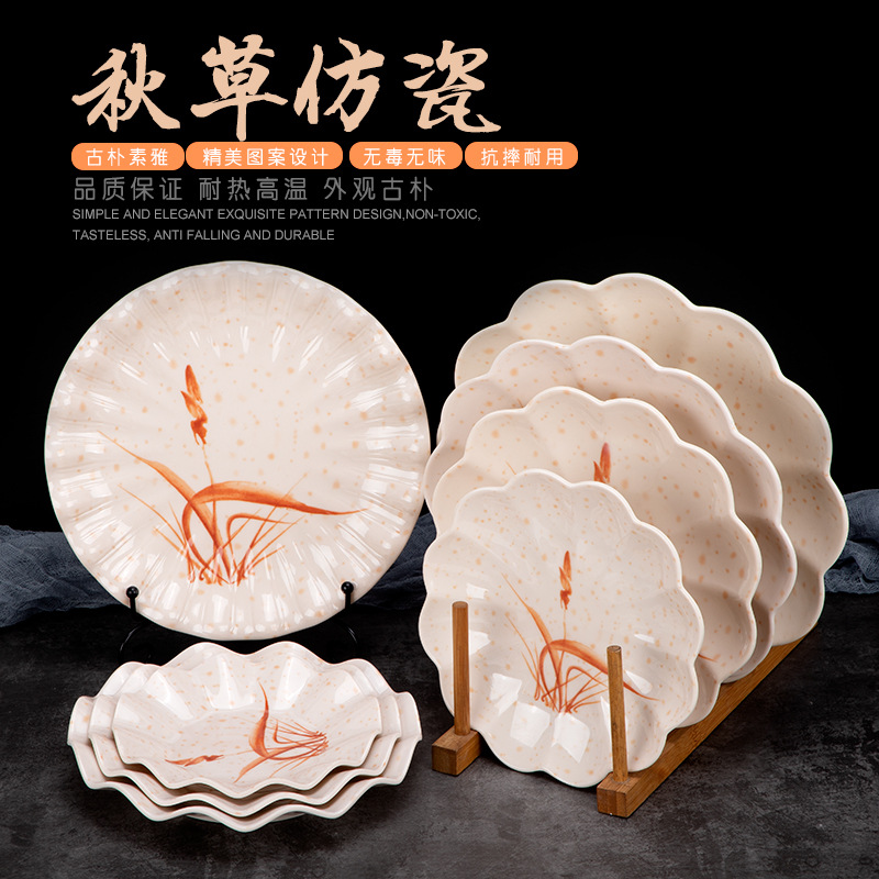 秋草メラミンプラスチック円形創意蓮のそば料理皿スナック皿チャーハン皿波紋皿耐落下食器