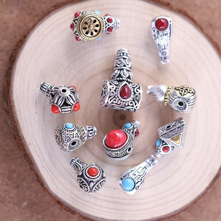 ネパール穿孔チベット銀モザイク樹脂ドリル福字六字真言散珠手作り復古喜字数珠隔珠
