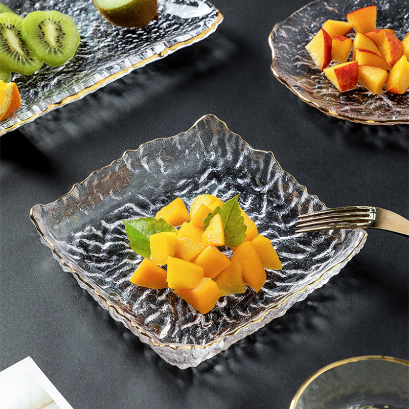 金縁ガラスアイスデューディスク和風不規則なハンマーパターンフルーツサラダ寿司プレート食器卸売ゴールデンストーン