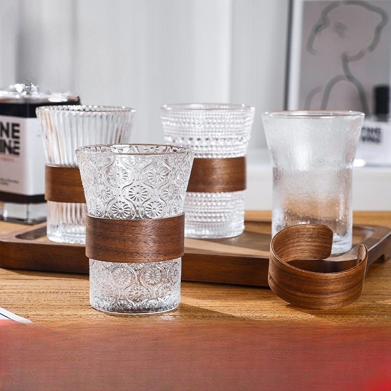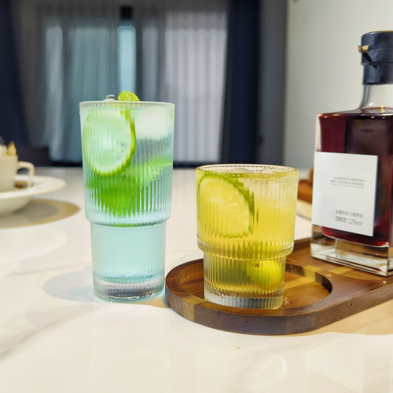 中国のレトロなガラスウォーターカップ、縦縞のウォーターカップ、アコーディオンウエストコーヒーカップ、お土産カップ、ミルクジュース断熱カップ