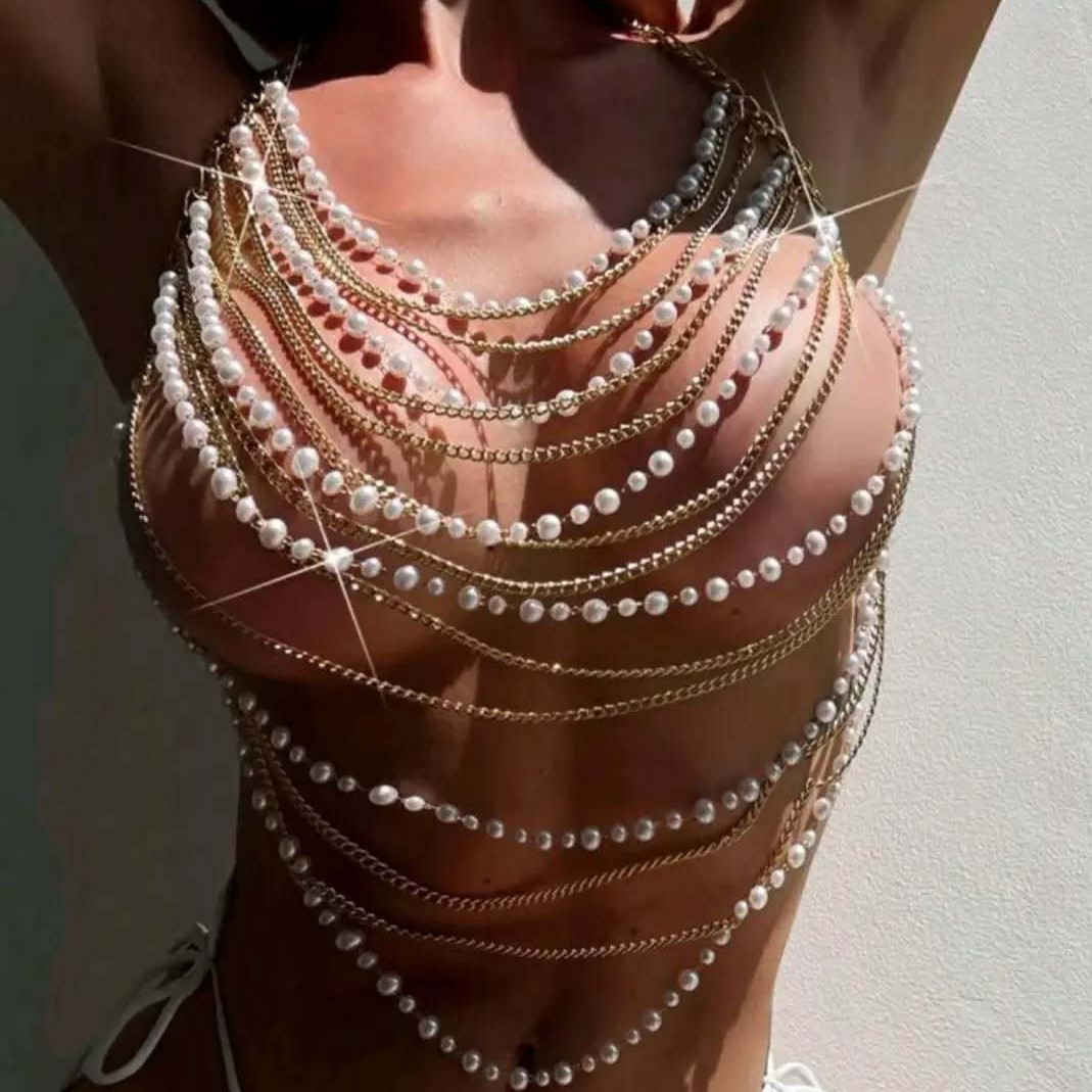L6561Y 手作りシェルビーチチェストチェーンボディチェーンコルセットホリデー衣装パールチェーンベストトップ