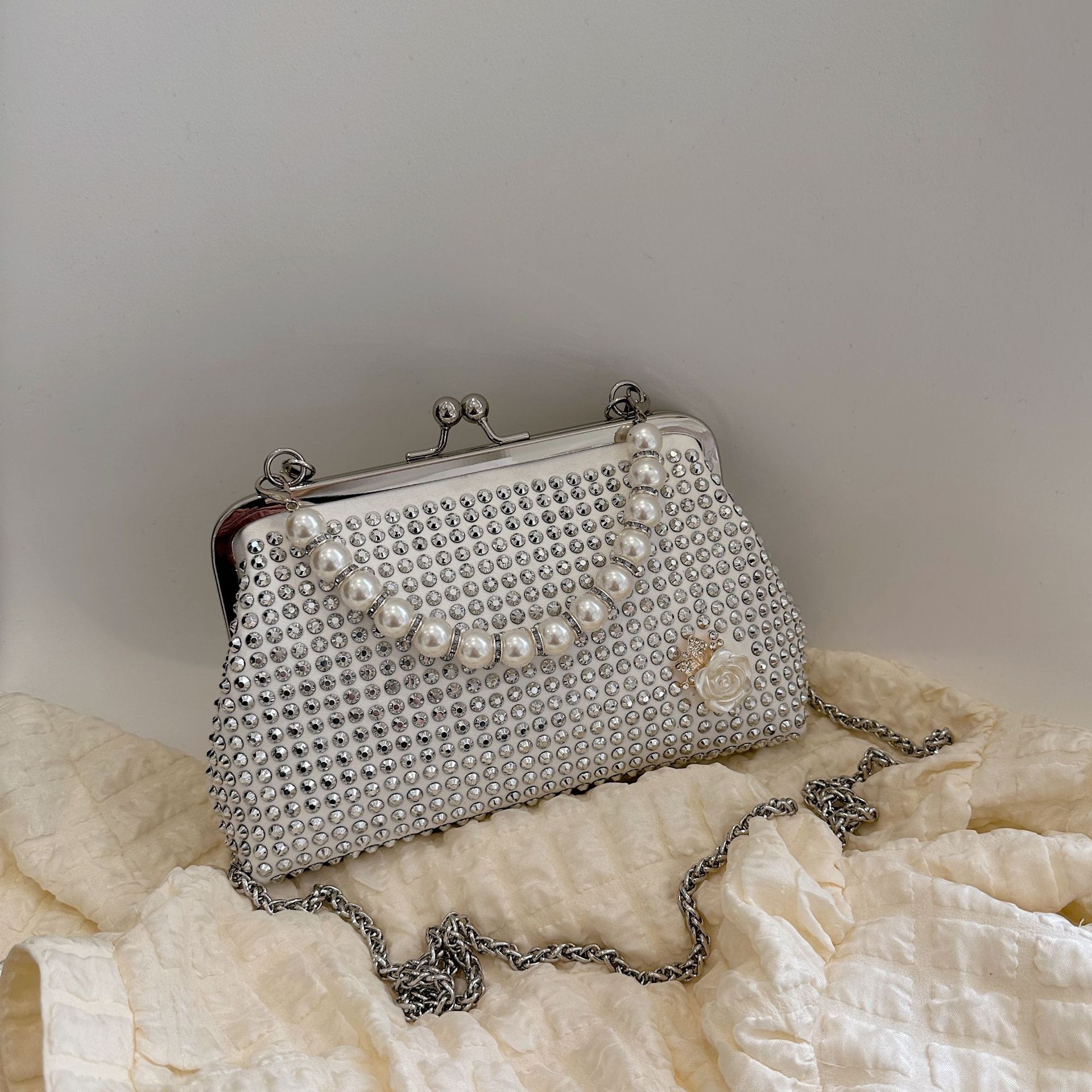 女性のためのテクスチャードバッグ 2025 新しいトレンディなファッショナブルなパールポータブルクリップバッグダイヤモンドチェーンショルダークロスボディバッグ