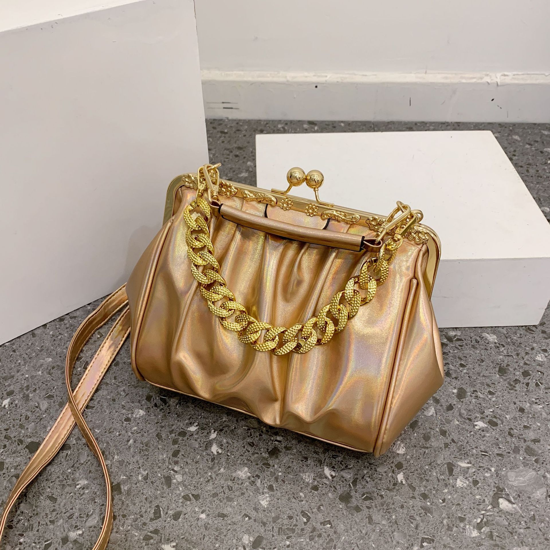 ヨーロッパとアメリカのファッショナブルなメタルチェーン、新しい2025個性、コントラストカラー、シンプルな気質、イブニングショルダークロスボディクラッチバッグ