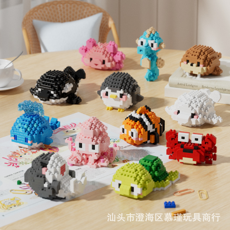 海の生物の積み木の小さい四角の粒はおもちゃを詰めてレゴの子供の模型のサメのペンギンに対応します。