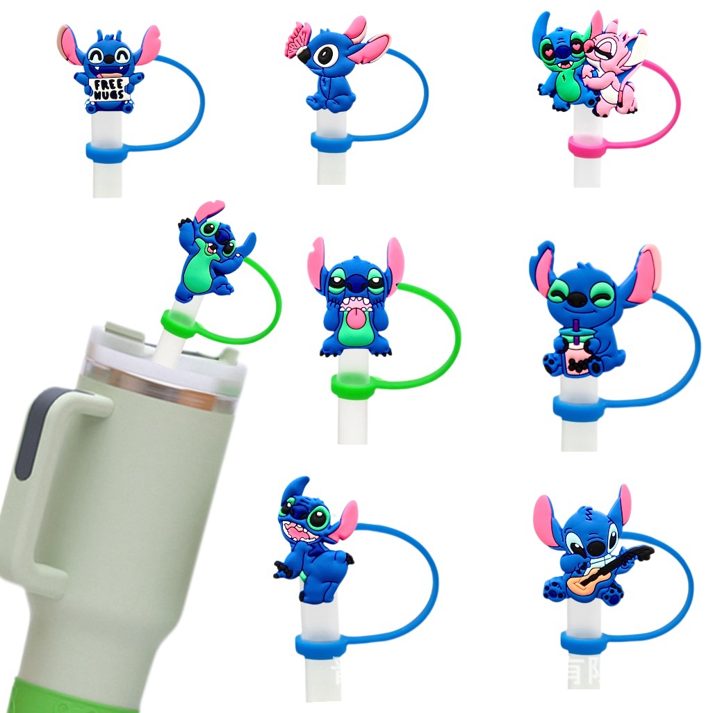 ブルースティッチシリコンストローキャップ、再利用可能なストローカバー、漫画ストロー防塵キャップ、工場直販