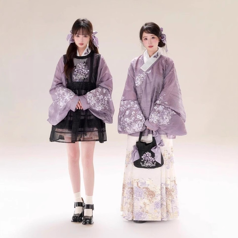 新しい中国風【花霧】オリジナルピパスリーブクロスカラーシャツ明製新漢服女性黒ペチコート馬面スカートスーツ