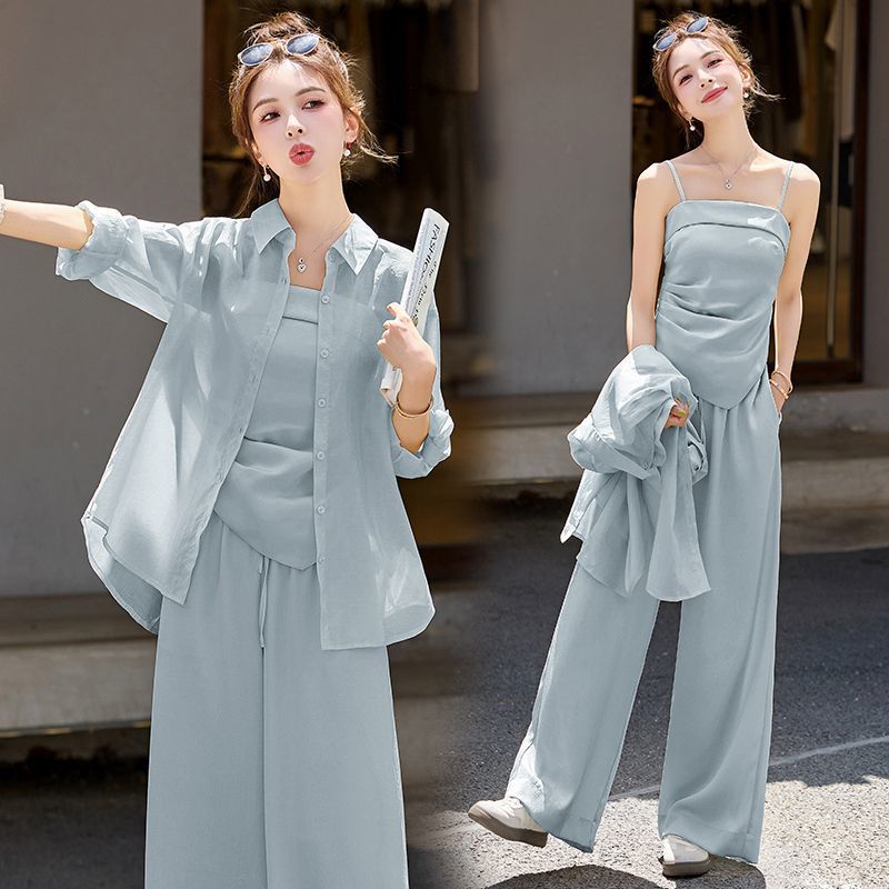おしゃれでシンプルな気質シャツ、日焼け止め服、ワイドパンツ3点セット、2025年夏新作小柄大きいサイズスーツ
