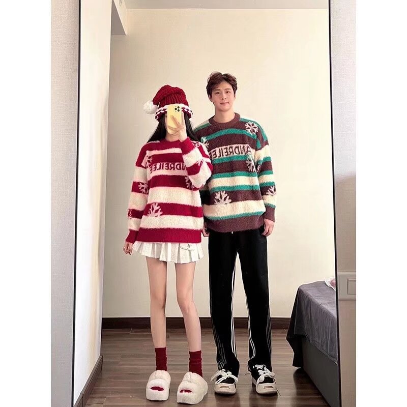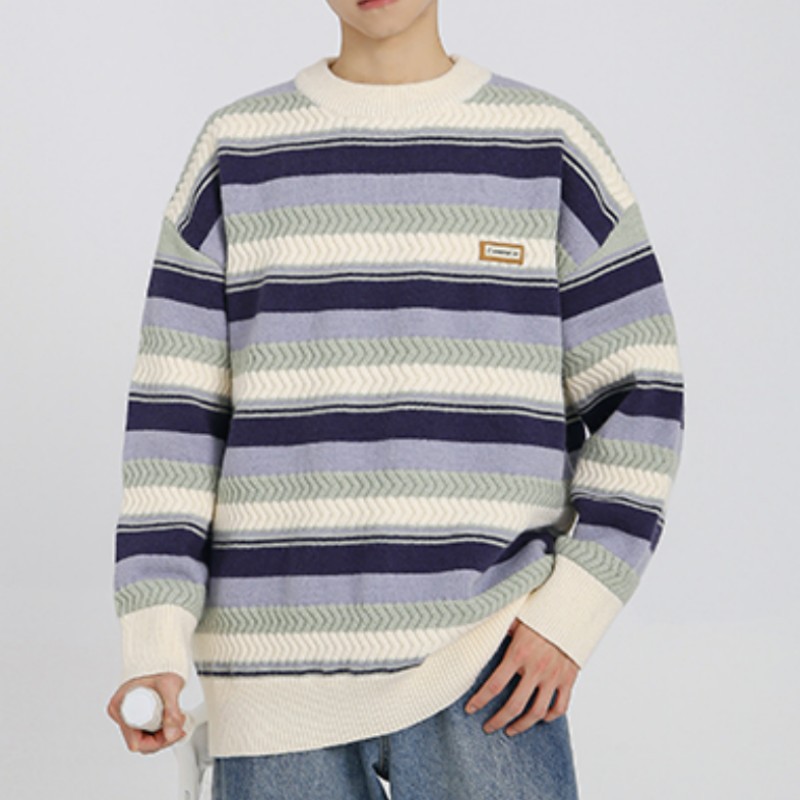 2023新型セーター男性冬丸首ニットコート男性カップルが頭をかぶせて怠惰な縞模様をつなぎ合わせて底をつく