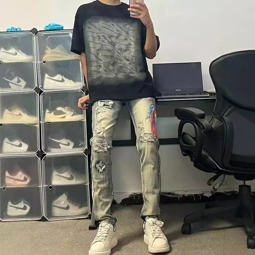 高街風破洞ジーンズ夏のごろつきイケメンブランド男性韓国版カジュアルヒップホップパンツ2024