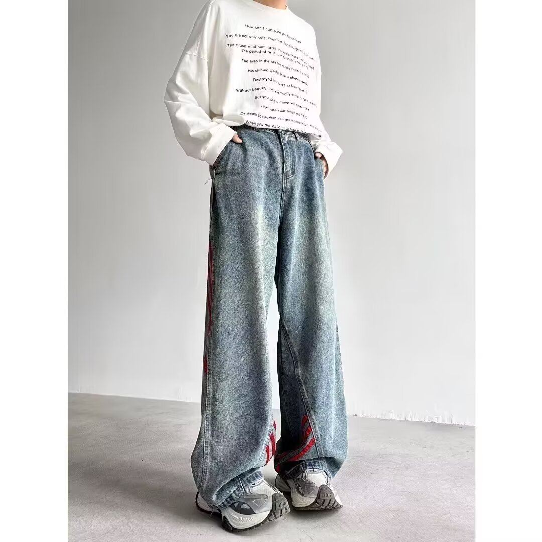 アメリカのレトロな古い縞の衝突色のジーパンの女性2024夏の新型のゆったりした工装のまっすぐな筒の広い足の長さ