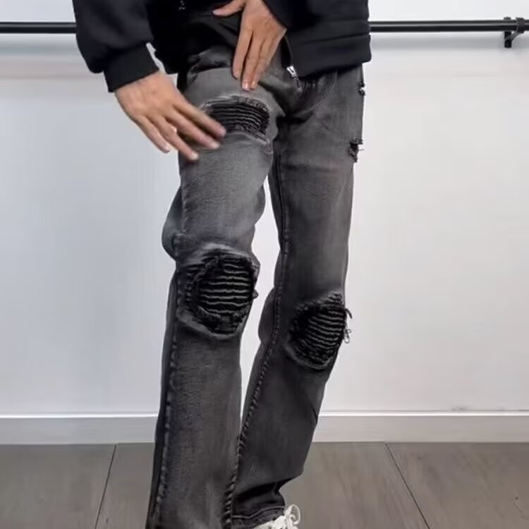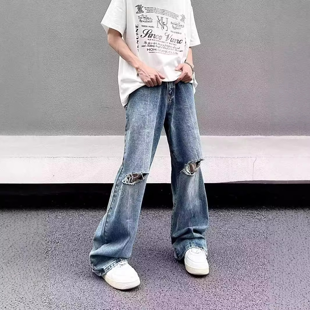 アメリカのレトロなカジュアルな男性の穴を割った馬の糸のジーパンの男性の高い街の小さい大衆の夏のカップルの広い足のズボンの潮牌