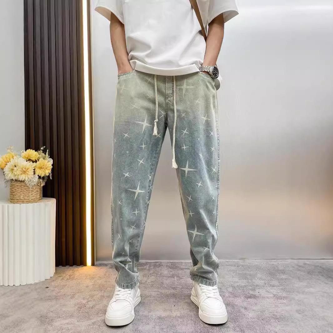 香港風潮男夏の新型2024個性的なジーンズヒップホップins潮高街の流行ごろつきのハンサムなズボン